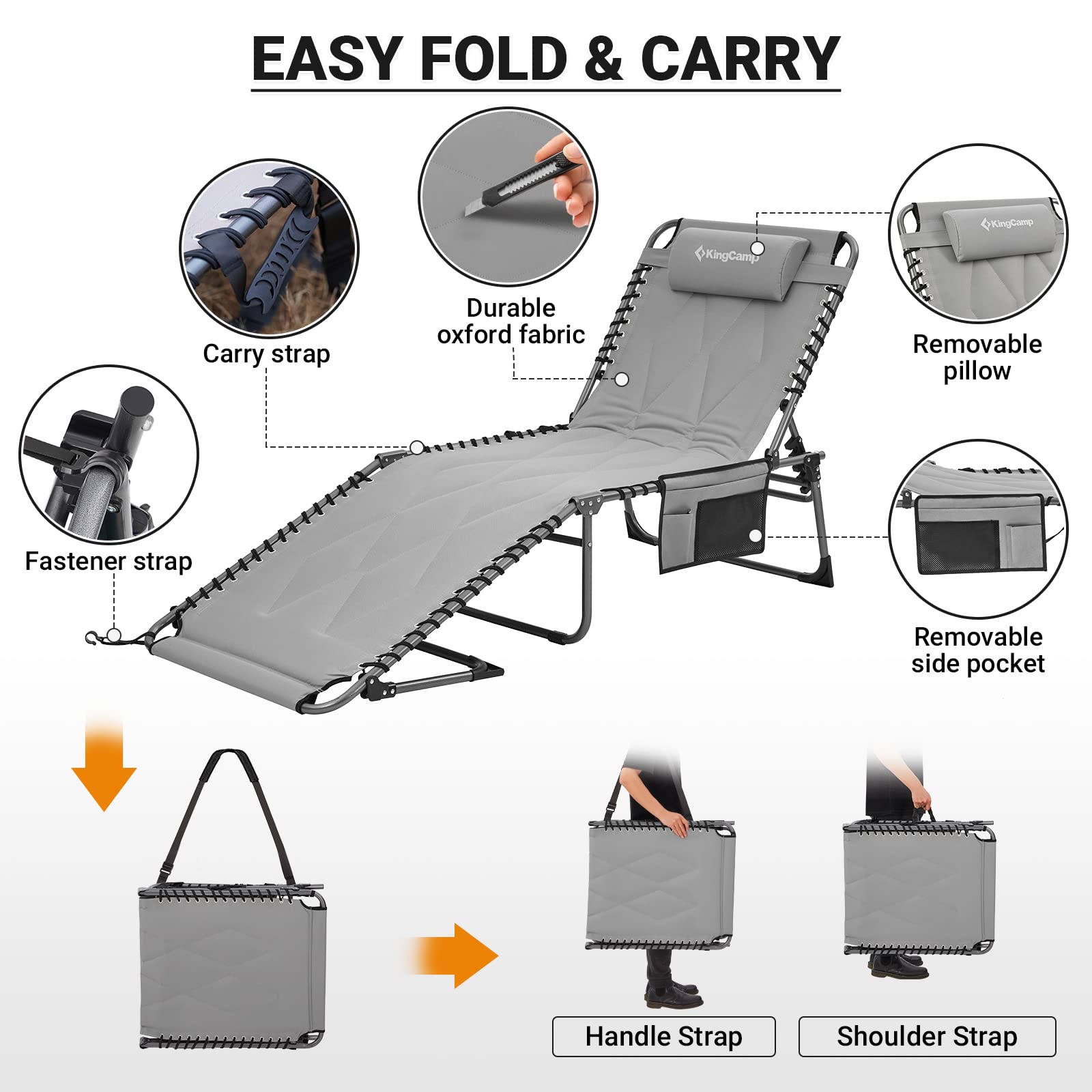 5-Position Lounge Chair Experience customizable comfort with our chaise lounge chairs featuring a convenient triangle locking system. Whether used as a bed, camping cot, backrest bed, or chair, they are perfect for various settings like the beach, patio, pool, lawn, garden, deck, office nap, bedroom, balcony, or as a temporary bed for guests. Suitable for children, adults, and elders, providing leisure for everyone.